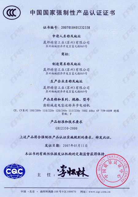 CCC電容運(yùn)轉(zhuǎn)減速機(jī)證書(shū)